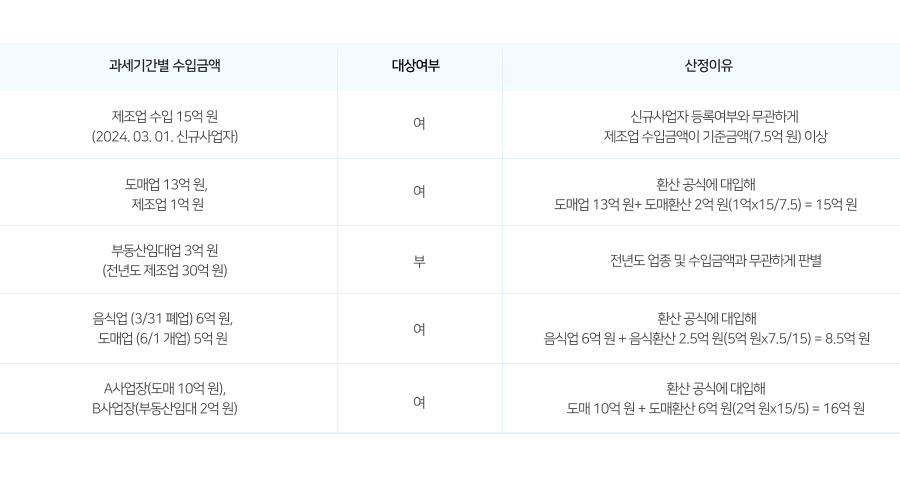 → 연간 수입금액 15억 원 이상 - 제조업, 음식·숙박업, 정보통신업 등